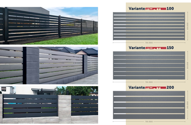 Variante FORTE to nowa generacja ogrodzeń stalowych – jeszcze trwalsza, jeszcze mocniejsza. Wykonane z wysokiej jakości stali o grubości 0,7 mm. Variante FORTE zapewniają do 40% większą sztywność, umożliwiając projektowanie szerszych przęseł bez kompromisów w zakresie stabilności. Dzięki zwiększonej wytrzymałości, szerszym przęsłom możemy ograniczyć do 30% czas montażu ogrodzenia. Variante FORTE występuje w 2 kolorach RAL 9005 Czarny Ultramat oraz RAL 7016 Antracyt Ultramat.